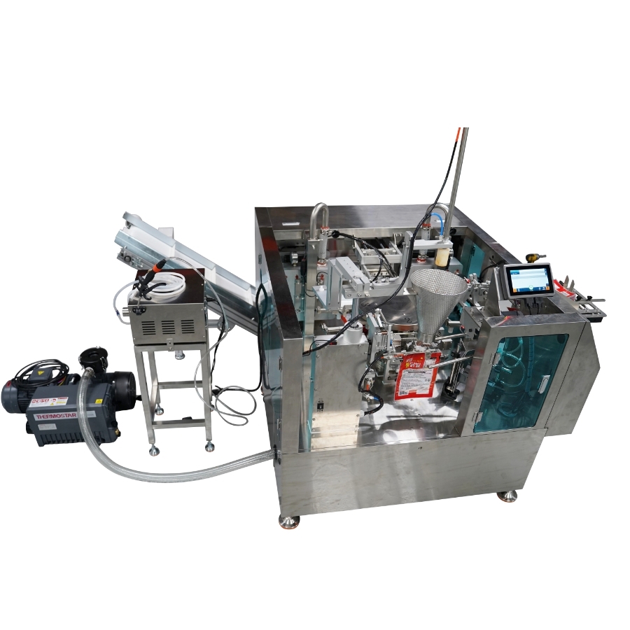파우치 로타리 챔버형 진공포장기계는 작은 규격의 로타리 진공포장기계로 수동으로 상품을 공급해야만 하는 형태를 위해 주로 사용되며 특이하게도 액상이 있는 상품도 깔끔한 진공포장이 가능한 기계입니다.